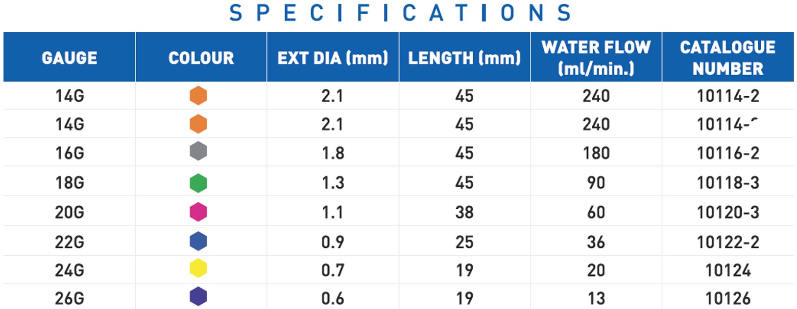 26G for Neonatal, 22G-24G for Child, 14G-20G for Adult.